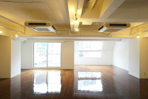 天井剥き出しタイプでエアコン・ライティングレールも完備されています。