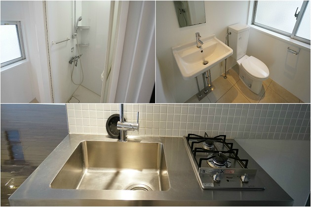 右奥がシンク・お手洗い・シャワーブースと一箇所にまとめられています。