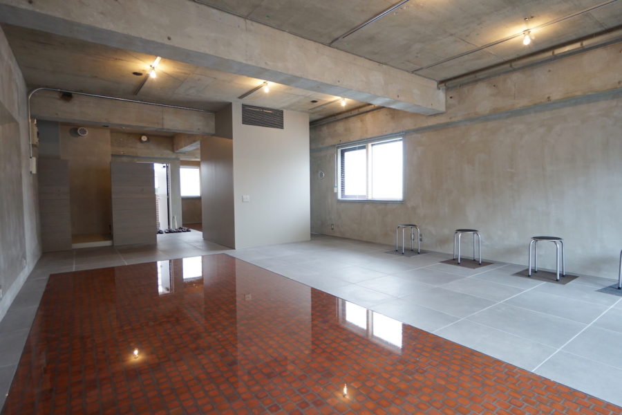 床は大判のフロアタイルと、部分的に1cmレベルを下げたブリックタイルの上に樹脂素材のゴムを敷いている。
