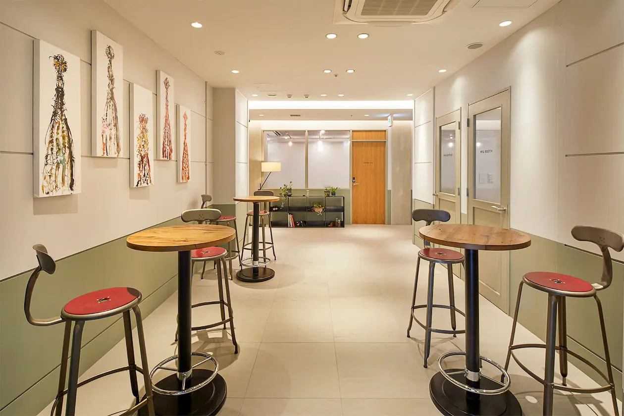 入居者が使用できる共用のワークラウンジ。奥のドアはコープオリンピアの住居区画のエントランスへ繋がっています。