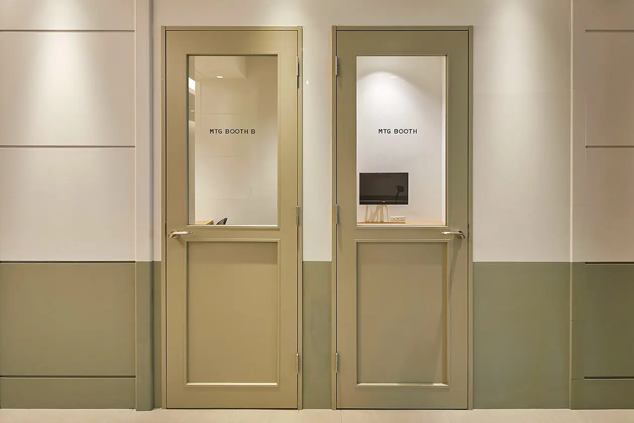 左側には今回のウリの一つである、ミーティングブースを設置し打ち合わせやオンライン会議にも対応可能。