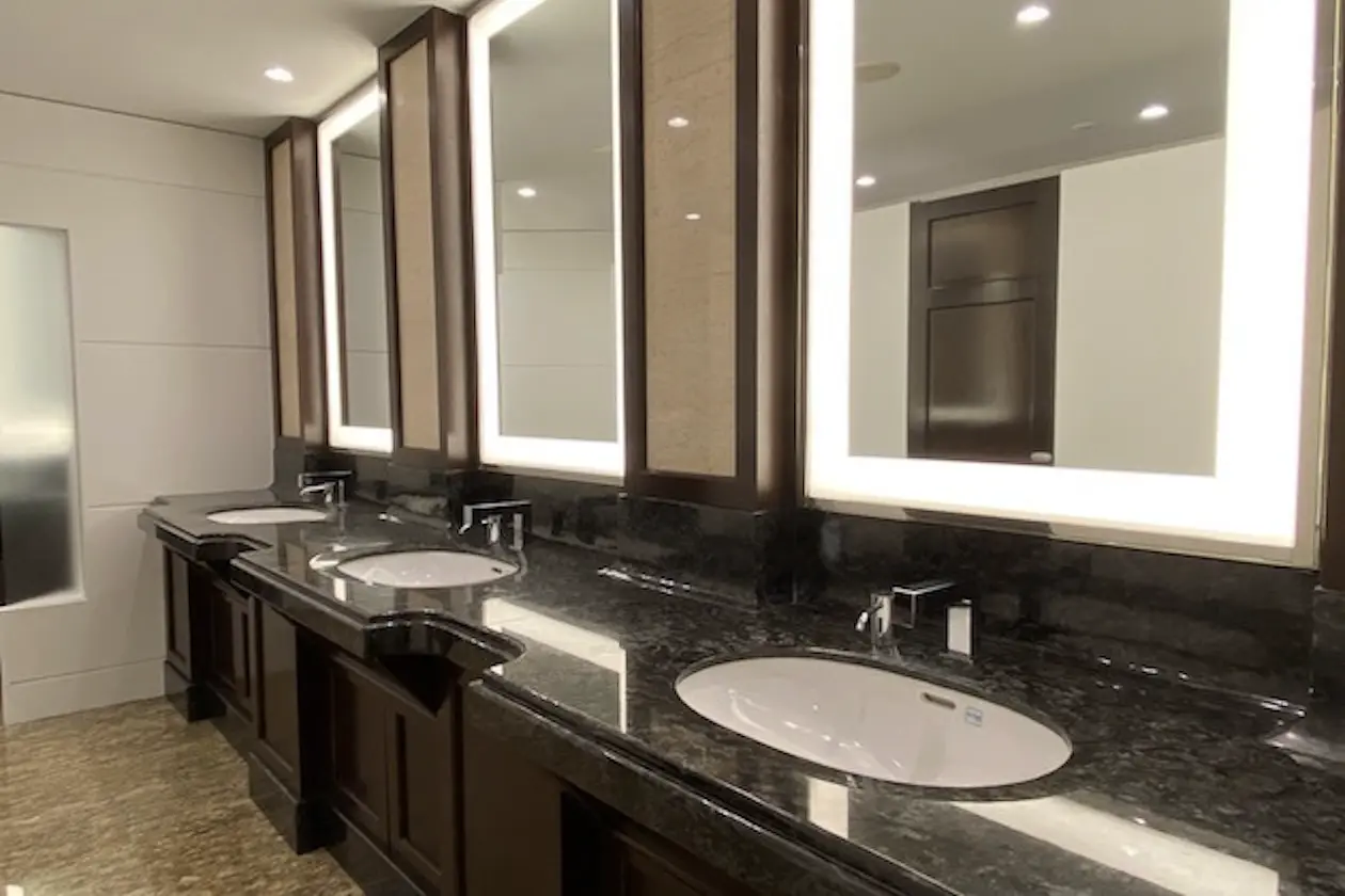 ただ暗くなりがちの空間は、壁面とガラスブロックの間に照明を入れることで、自然光が入っているような印象です。
