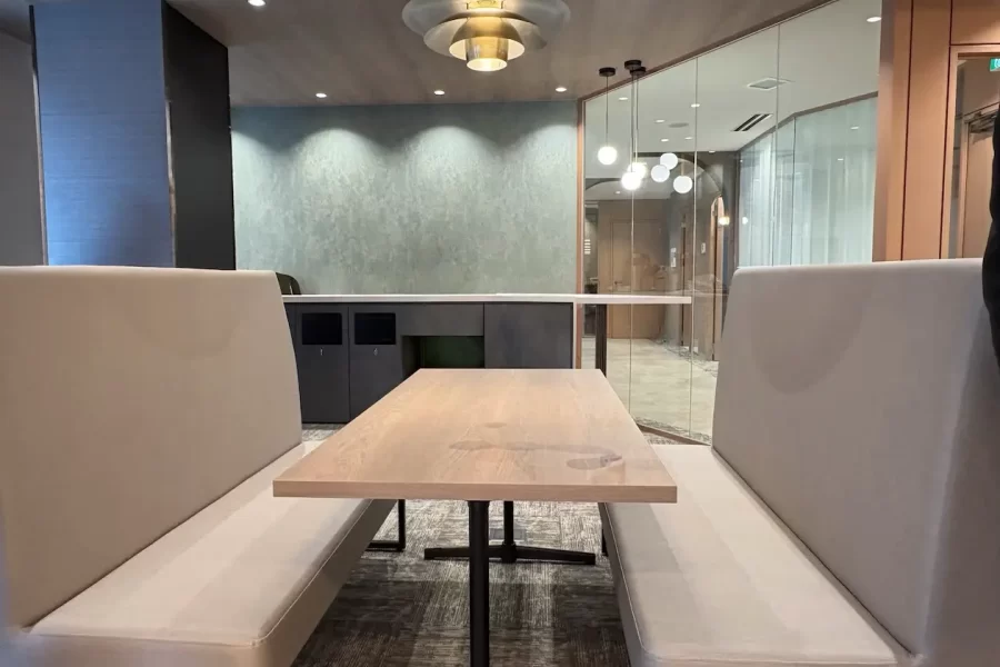 ファミレスタイプのソファー席が2つに、店舗のようなトラッシュボックス。