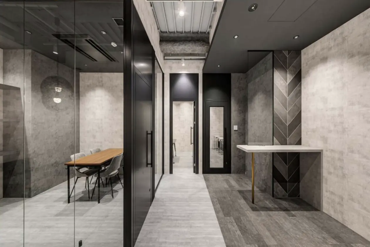 グレートーンを基調とした落ち着きのあるデザインで統一され、コンクリート調の壁面とブラックの建具が空間全体を引き締めています。天井高を最大限に活かした開放感のある空間設計で、梁や設備配管をあえて見せることで、圧迫感の少ない伸びやかな印象に仕上がっています。
