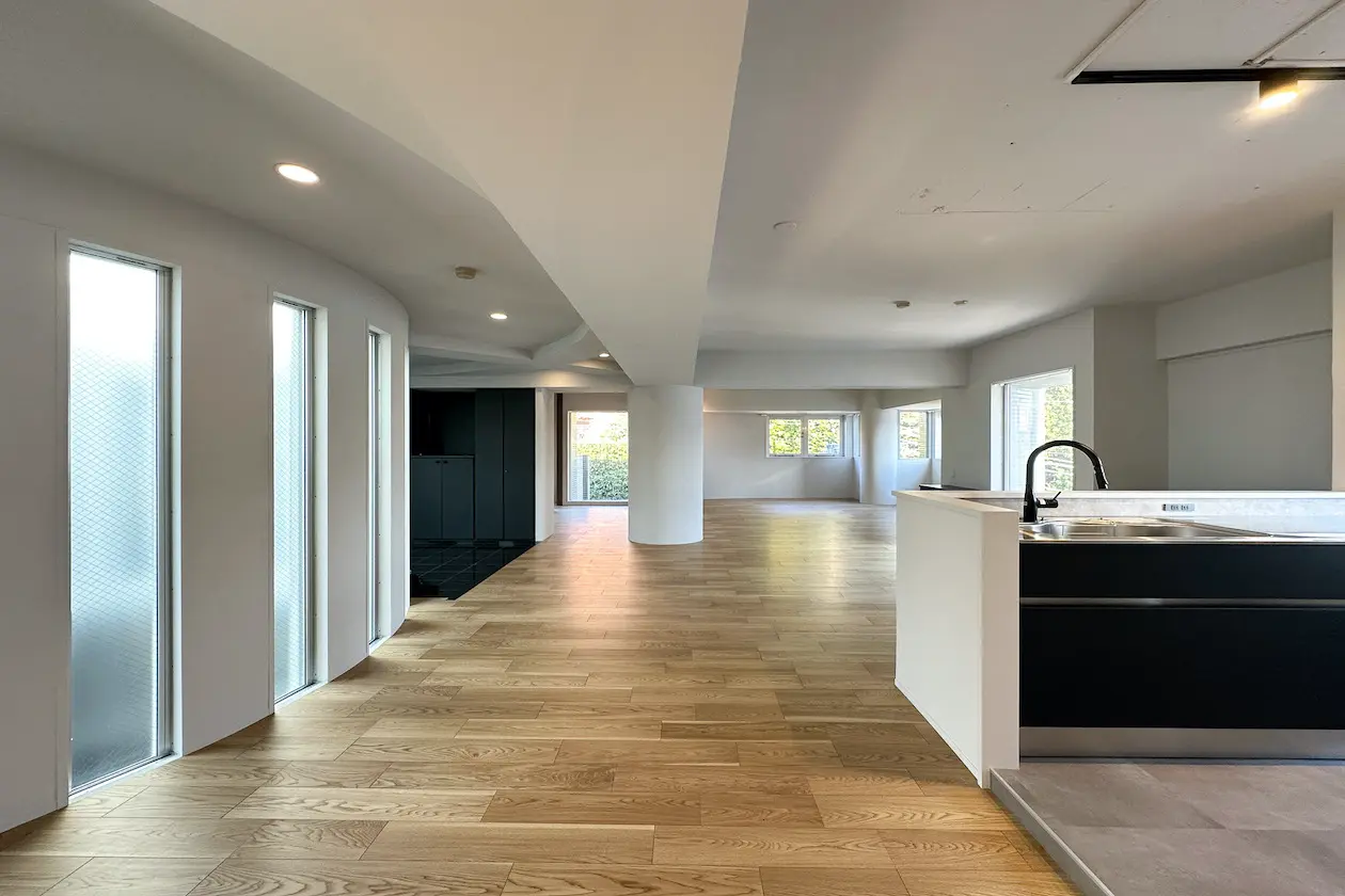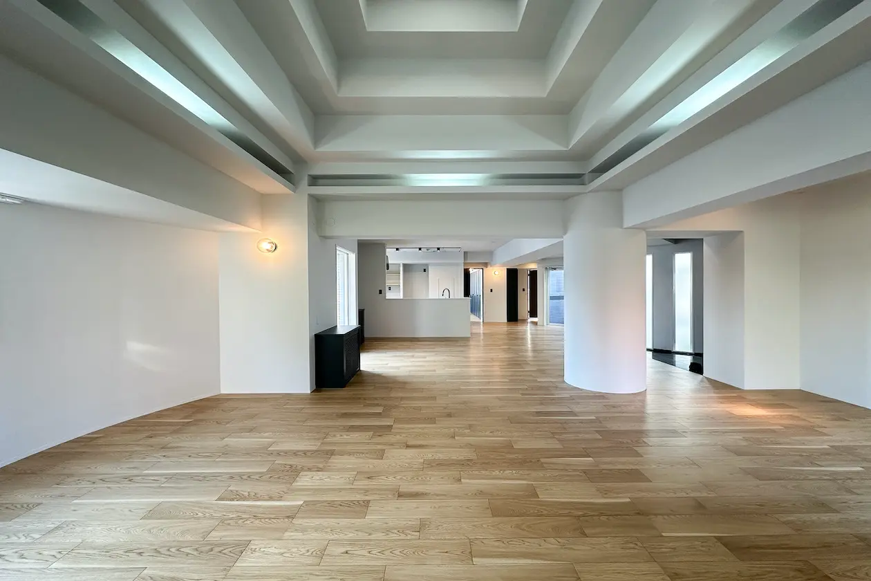 最上階の室内は2024年1月にフルリノベーションを済み、44帖のリビングダイニングは段階的に高くなる天井が特徴的。