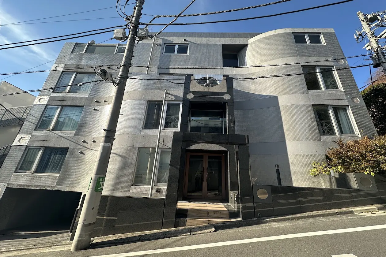 光沢のあるグレーのタイル貼りが特徴的な外観。