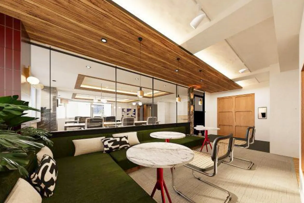 オフィスの顔となるラウンジは、織物のようなディープグリーンのソファと、赤いスチール脚がアクセントになった丸テーブルが印象的。質感のあるウッド天井にペンダントライトが落ちて、ちょっとしたカフェのような落ち着いたトーンです。