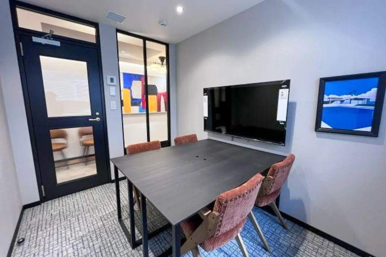 グレートーンの落ち着いた部屋に、4〜6名で使える会議テーブルと新品の大型モニターを完備。