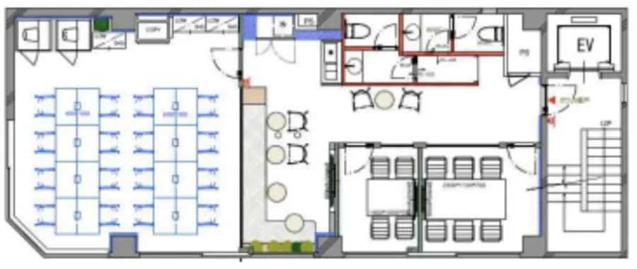 2階ワンフロアを丸ごとリノベしていて、16席の執務室に、会議室、ラウンジ、キッチンまでしっかり揃っています。