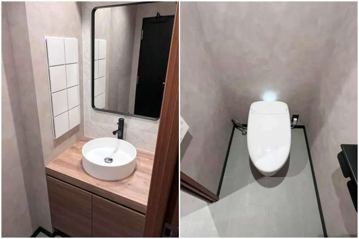 ブラックの水栓とミニマルなミラー枠が空間を引き締め、オフィス全体のデザイン性と自然にリンクしています。