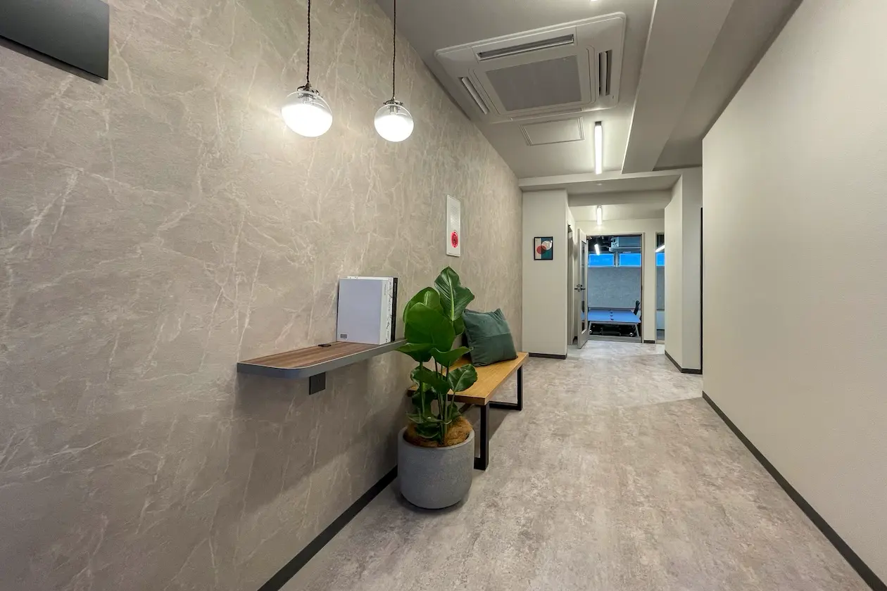 こちらは102号室の室内の様子。エントランスから続く動線には、石目調の壁と落ち着いた照明が施され、来訪者を迎える受付スペースとしても使いやすい設計。壁付けのカウンターやベンチが用意されているため、簡単なウェイティングや短時間の打ち合わせにも対応できます。