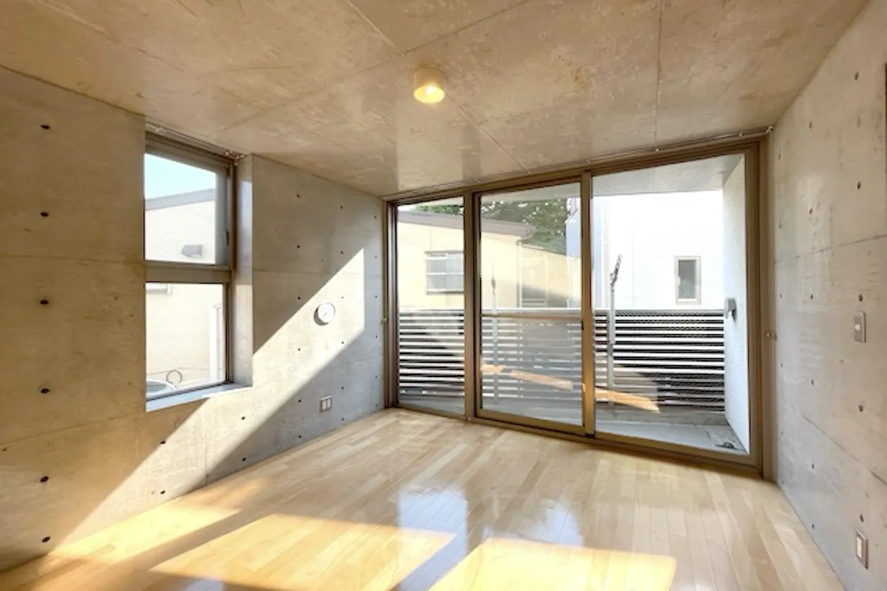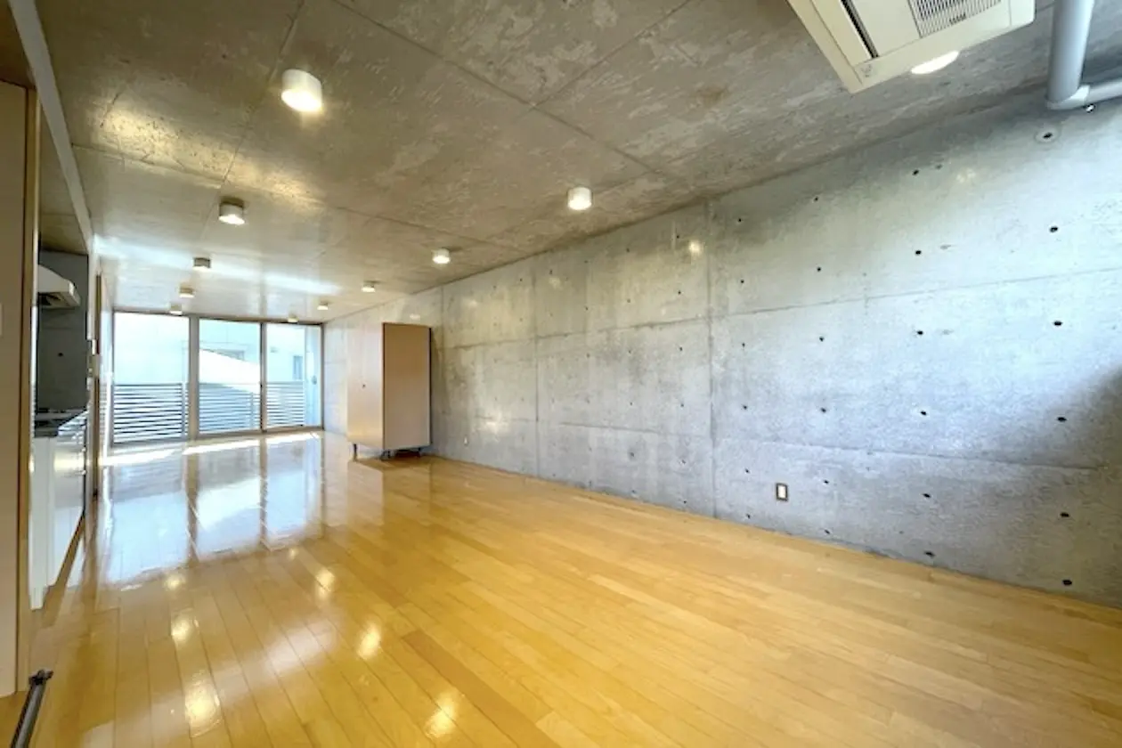 室内はコンクリートの打ちっぱなしの壁が広がり、そこにフローリングの明るい色が映え、クールかつ温かみのある印象。長方形のプランはレイアウトしやすく感じるのでは無いでしょうか。