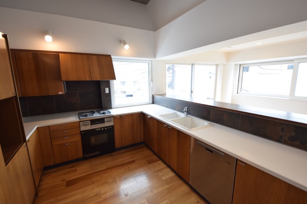 キッチンは広々としたコの字型、3口ガスコンロにグリル・オーブンに食洗機付きとフル装備。