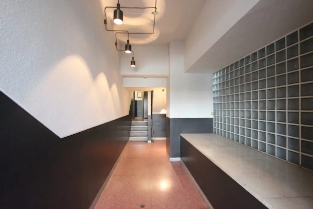 エントランスからエレベーターホールに続くアプローチは、レトロ感を存分に味わえる雰囲気。