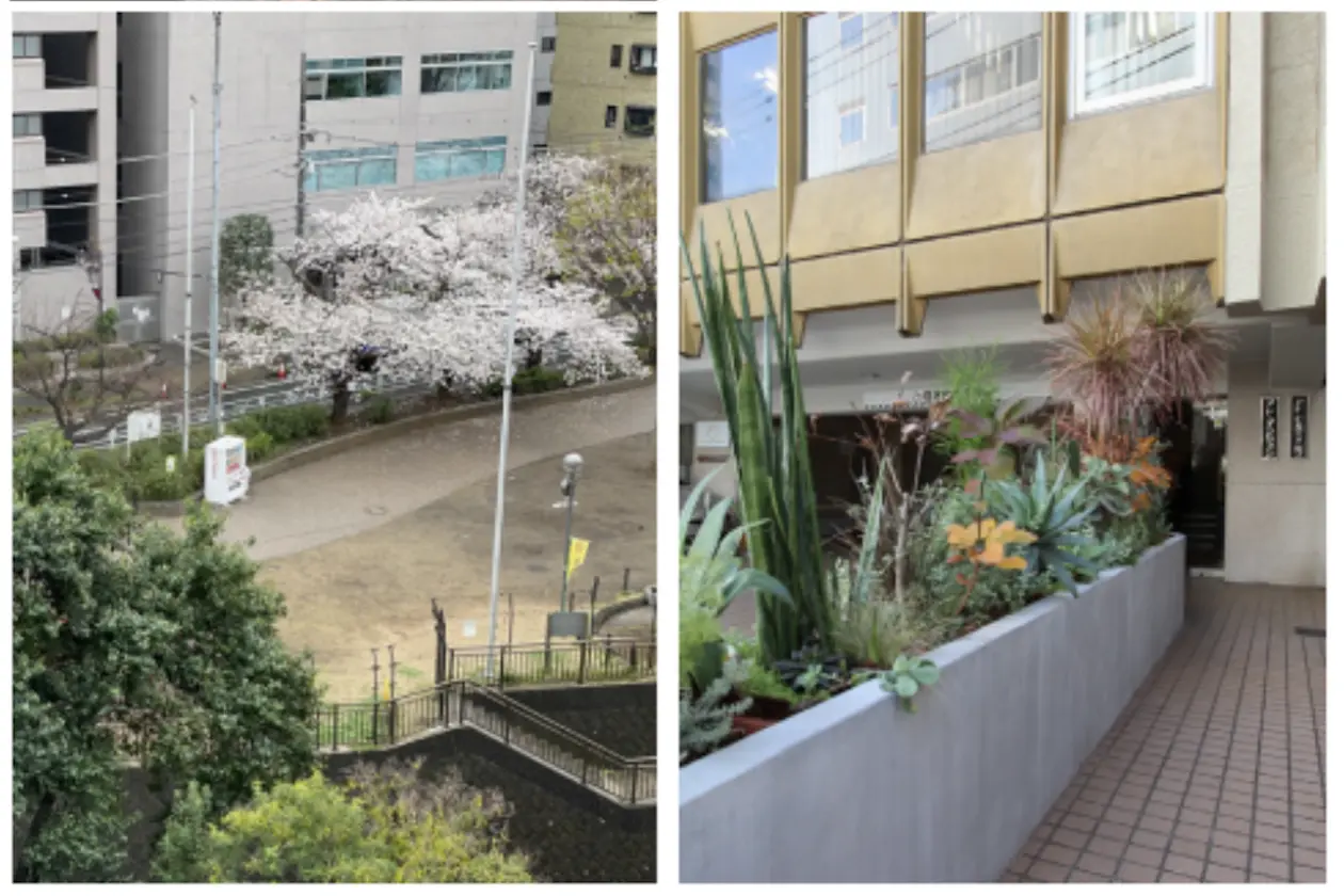 バルコニーからは公園が見え、エントランスには植物が植えられています。