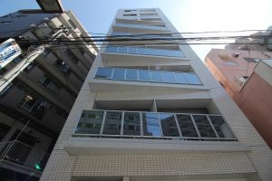 白タイルとガラス張りのバルコニーによってスタイリッシュさのある外観。1階は寿司屋が入る。外苑西通り沿いにあり、来客へ案内しやすい位置に存在する。