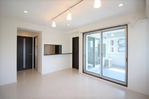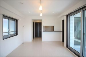 3面採光の部屋は自然の明るさがある。ホワイトに近い色のフローリングも明るい雰囲気にさせている。