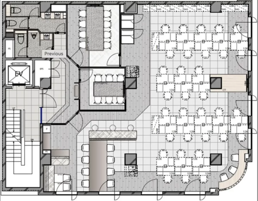 57坪のワンフロアは、レイアウト次第で30〜40名規模まで対応可能なサイズ感。島型デスク配置に加え、ラウンジやミーティングスペースを設けても十分な余白を確保できます。