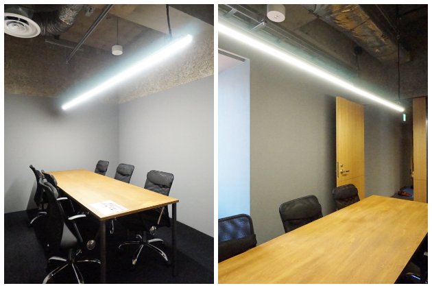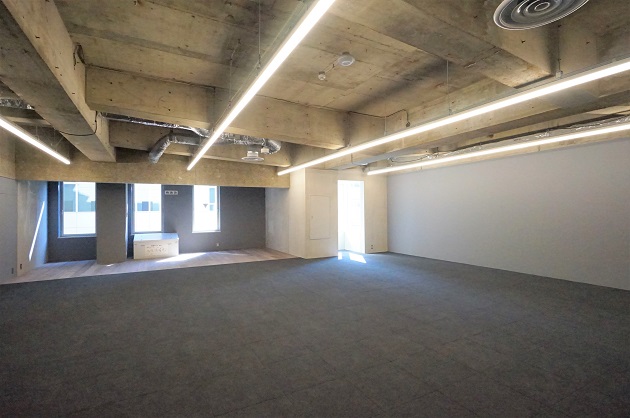Room1。OAフロア、カーペット仕様、3000mm越えの天井高、と嬉しいポイントが備わっています。20名程度は十分収まりそうなワークスペースです。