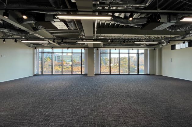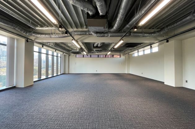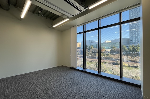白の壁にグレーのカーペット、天井はスケルトンとなっており、天井高は最大で3m。