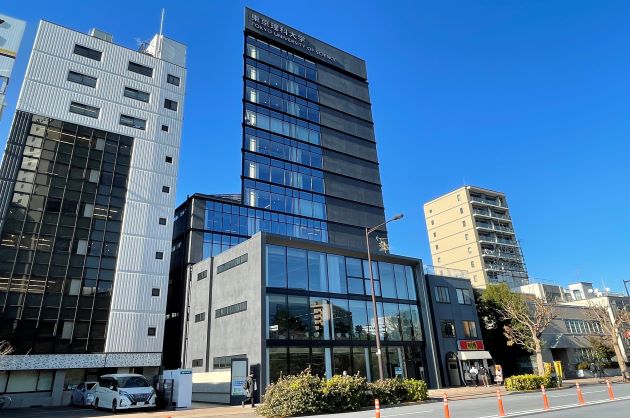 濃いグレーのコンクリートとガラス張りが組み合わさった外観は、ビルが立ち並ぶ大通りの中でも存在感を発揮しています。