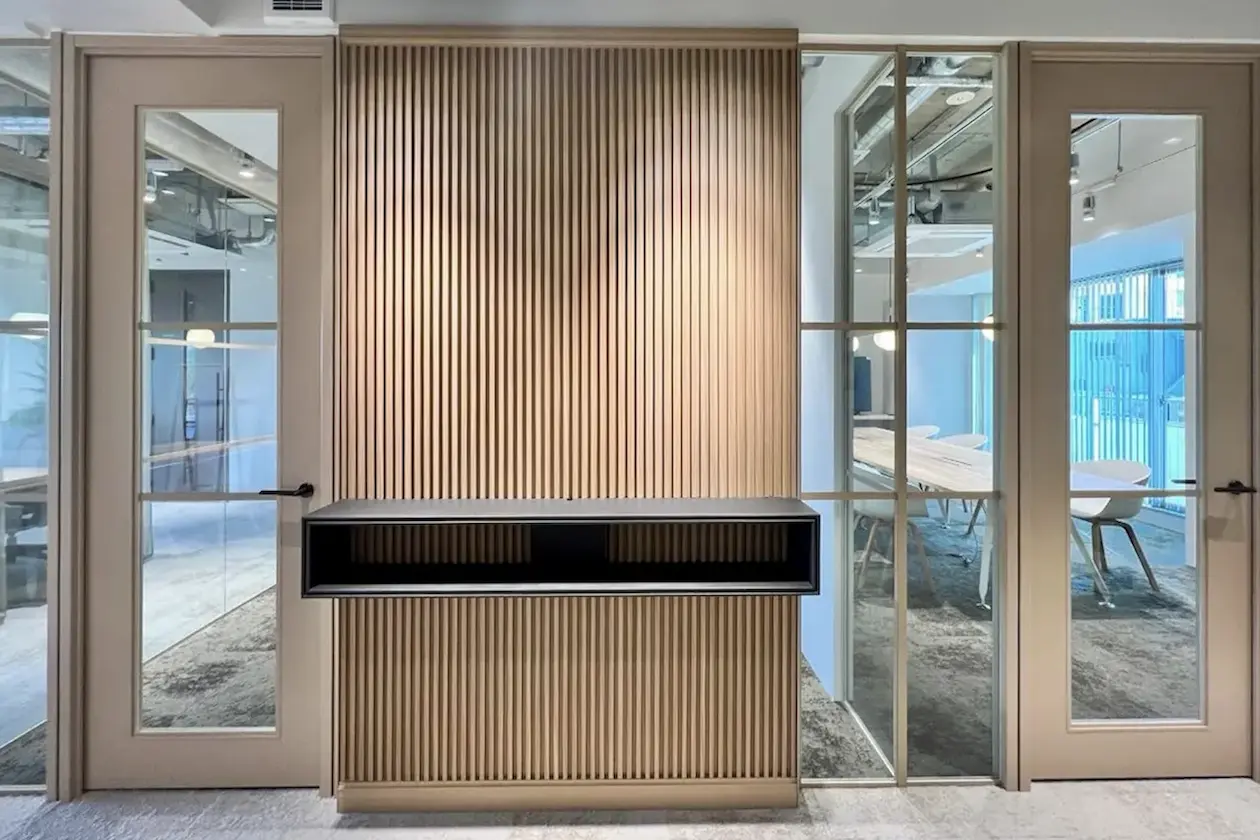 木ルーバーや造作家具、照明計画まで含めて丁寧につくられた空間は、来客時にも日常の業務時にも、きちんとした印象を与えてくれます。