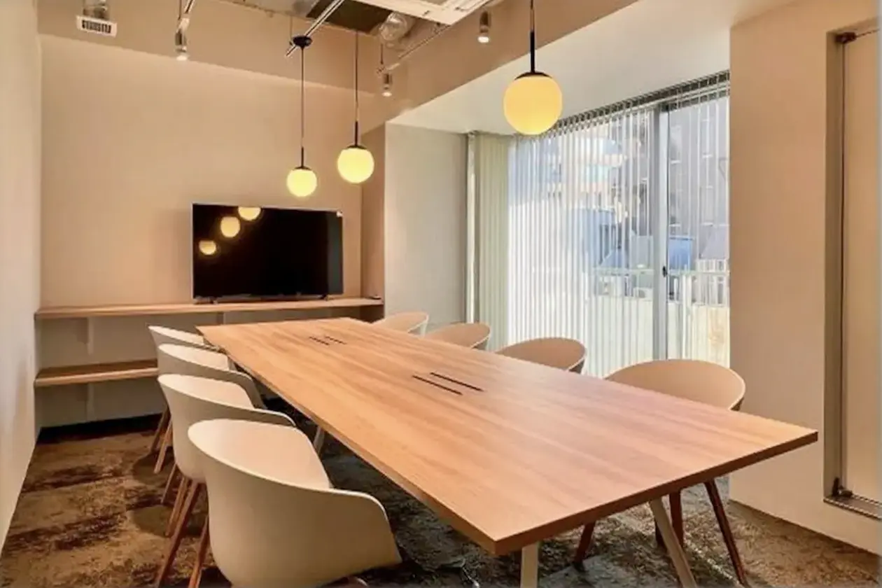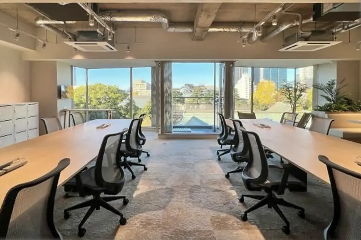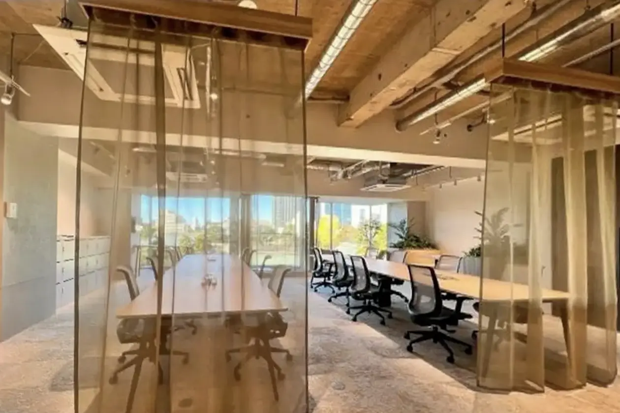 木の質感を活かした内装と、視線が抜ける大開口の窓が魅力で、会議室が2つ完備されてた充実度の高い区画となっています。