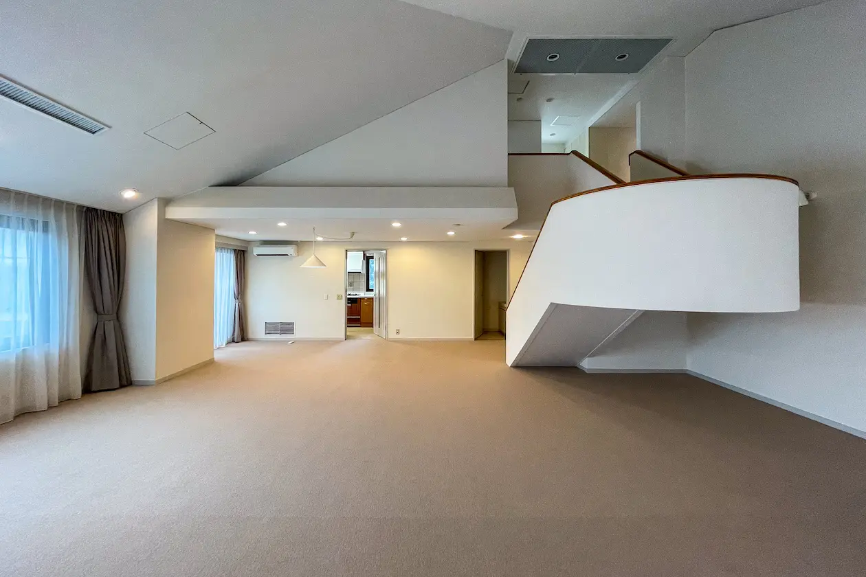白を基調とした壁面と、階段の曲線が描くデザインが相まって、空間全体に独特の個性と洗練をプラス。