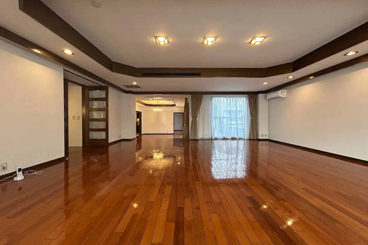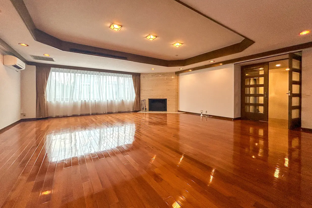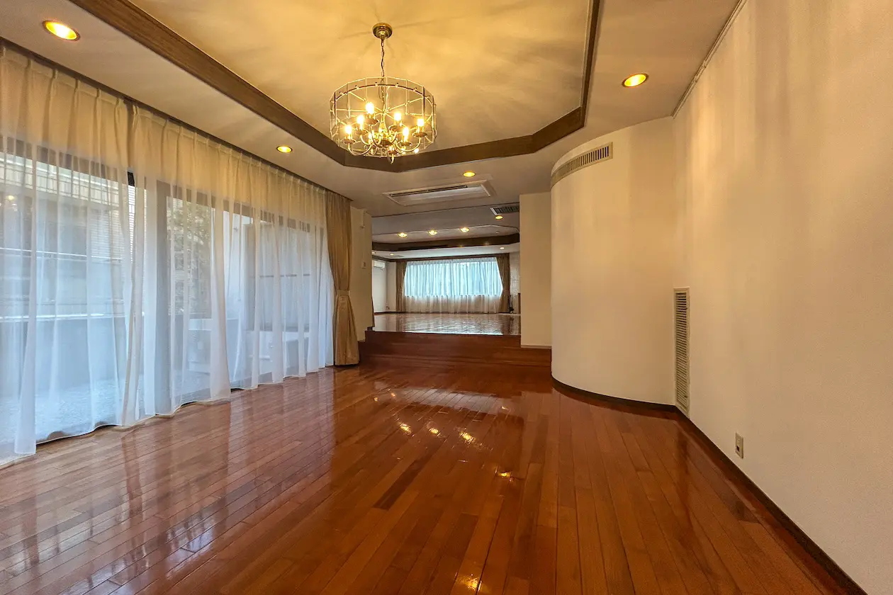 約36帖のメインリビングは、艶やかに磨かれたフローリングと間接照明が織りなす、上質で華やかな空間。