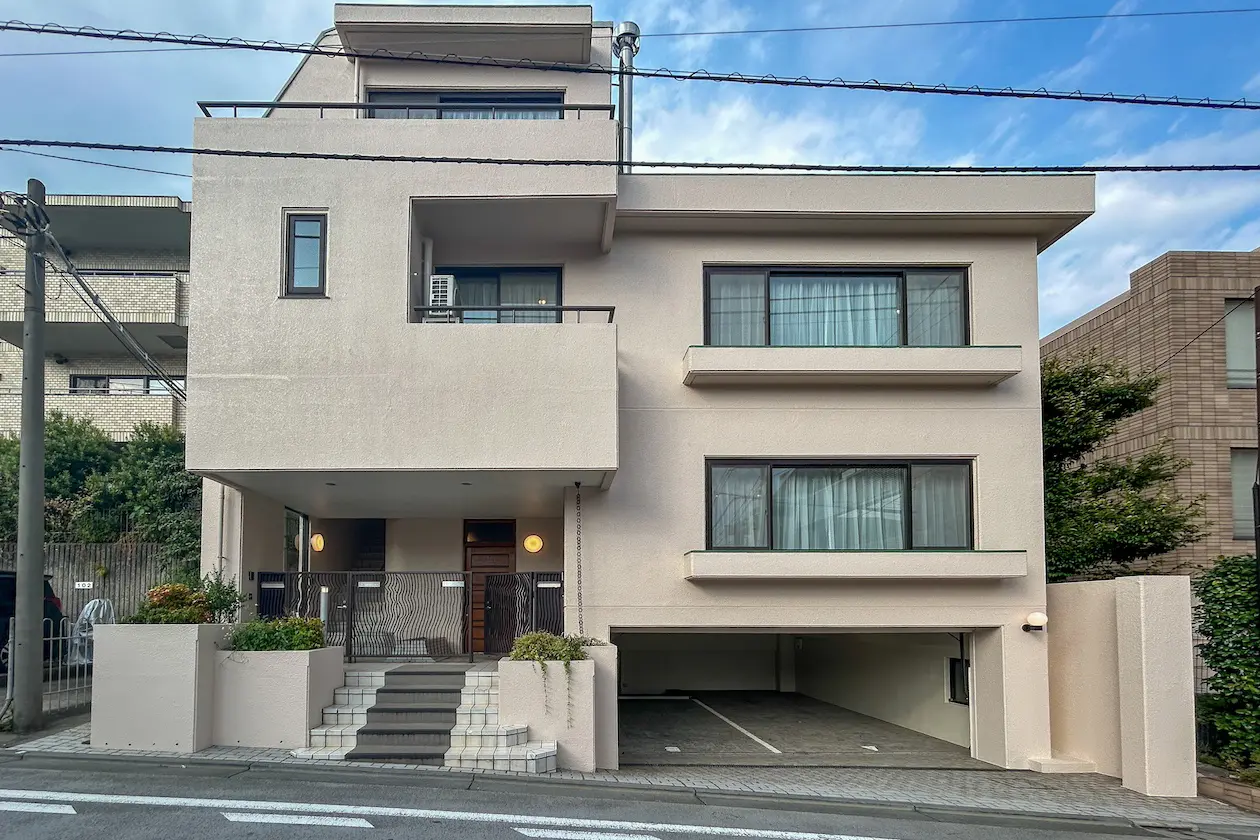 白を基調とした落ち着いたファサードに大きな窓が並び、シンプルながらも上品な印象を与えます。