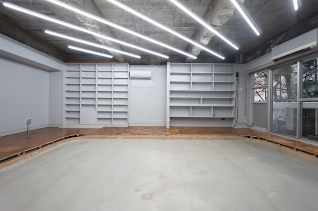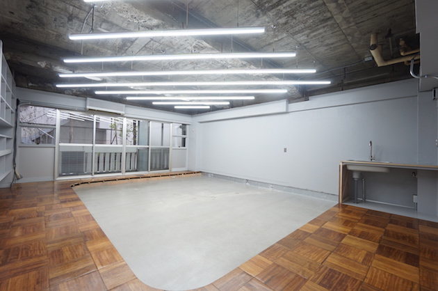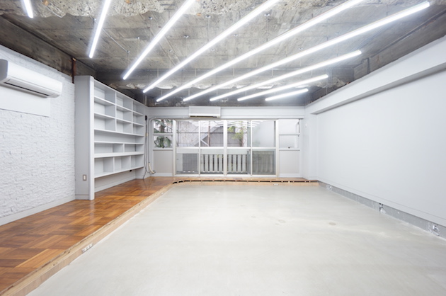 ご紹介するのは1階の区画。内装は躯体現しの天井にストライプ状の蛍光灯が並びます。