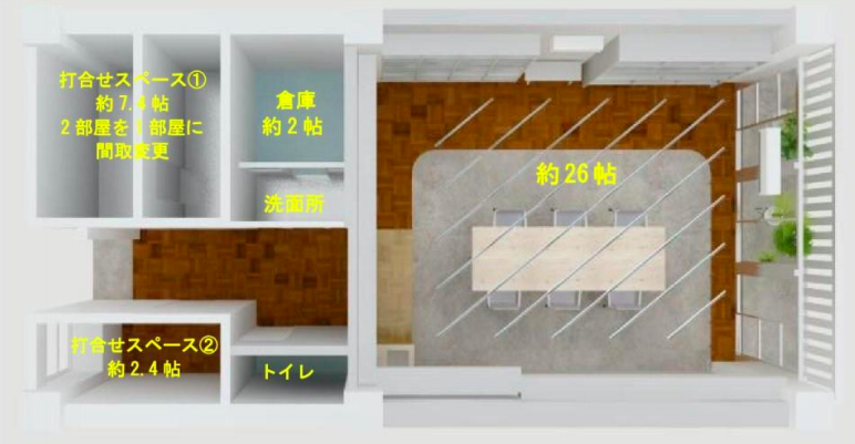 ヴィンテージマンションの一室をオフィス仕様にリノベーションして生まれ変わった本物件。多少の古さは否めませんが、立地やコスト重視の方にお勧めしたい一部屋です。