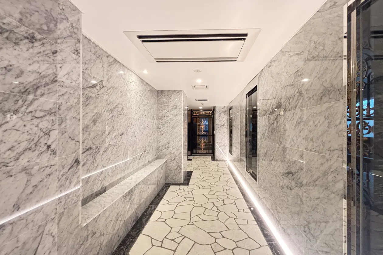 石調タイルとアイアン装飾が印象的な外観は、クラシカルな雰囲気と重厚感を演出。エントランスホールは大理石調の壁面に間接照明を備えられ、来客の方も安心してご利用になられます。
