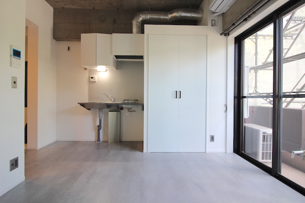 部屋がややコンパクトな分、バルコニー側の大きな窓からの光が室内奥までまで入ります。無機質な内装がより明るくなります。