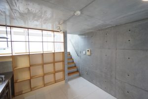 タイル貼りの床はコンクリートの無機質さを際立たせます。
