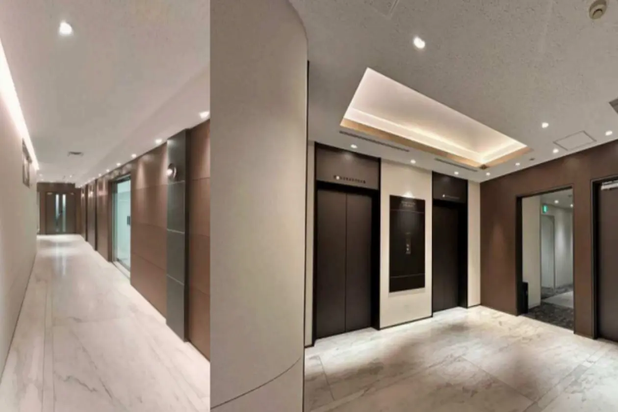 エレベーターを降りてから執務室までの動線も上質なデザインで統一され、来客や社員に安心感を与える空間です。