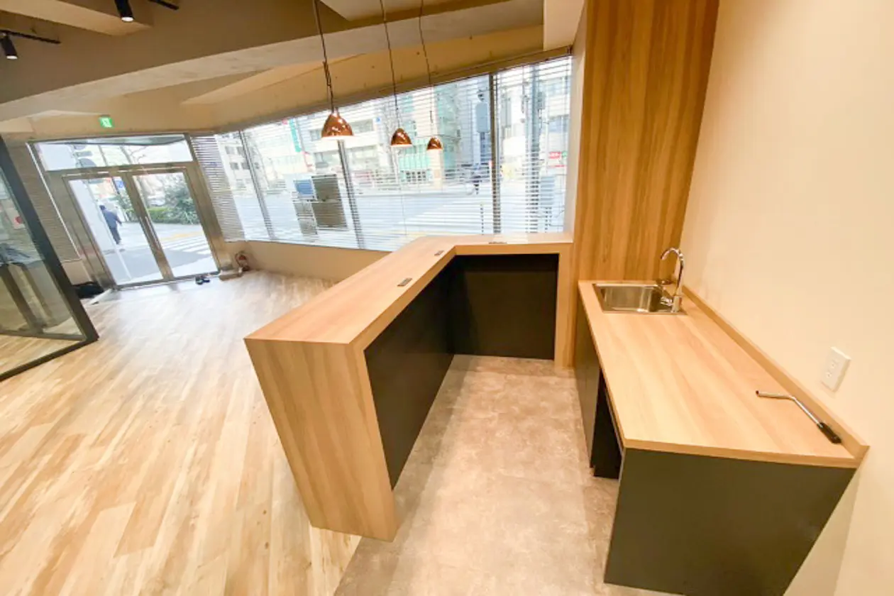 ガラス張りのエントランスを入ると、木目調カウンターが映えるレセプションスペース。