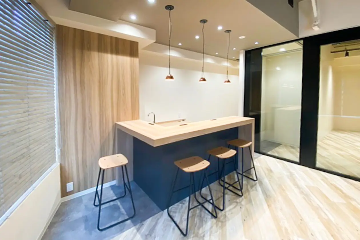 ガラスパーテーションで区切られたスペースは会議室や個別ブースとして柔軟に利用でき、バーカウンター付きオープンラウンジ、ワークスペース、6名対応の応接室も完備しています。