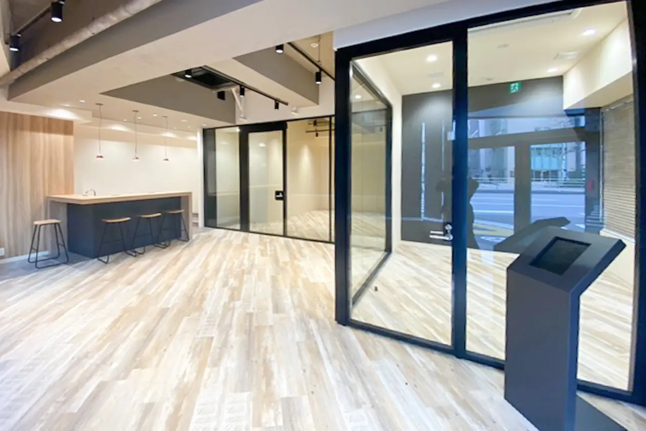 ガラスパーテーションによる柔軟なゾーニングが魅力で、事務所利用はもちろんショールーム展開にも最適です。