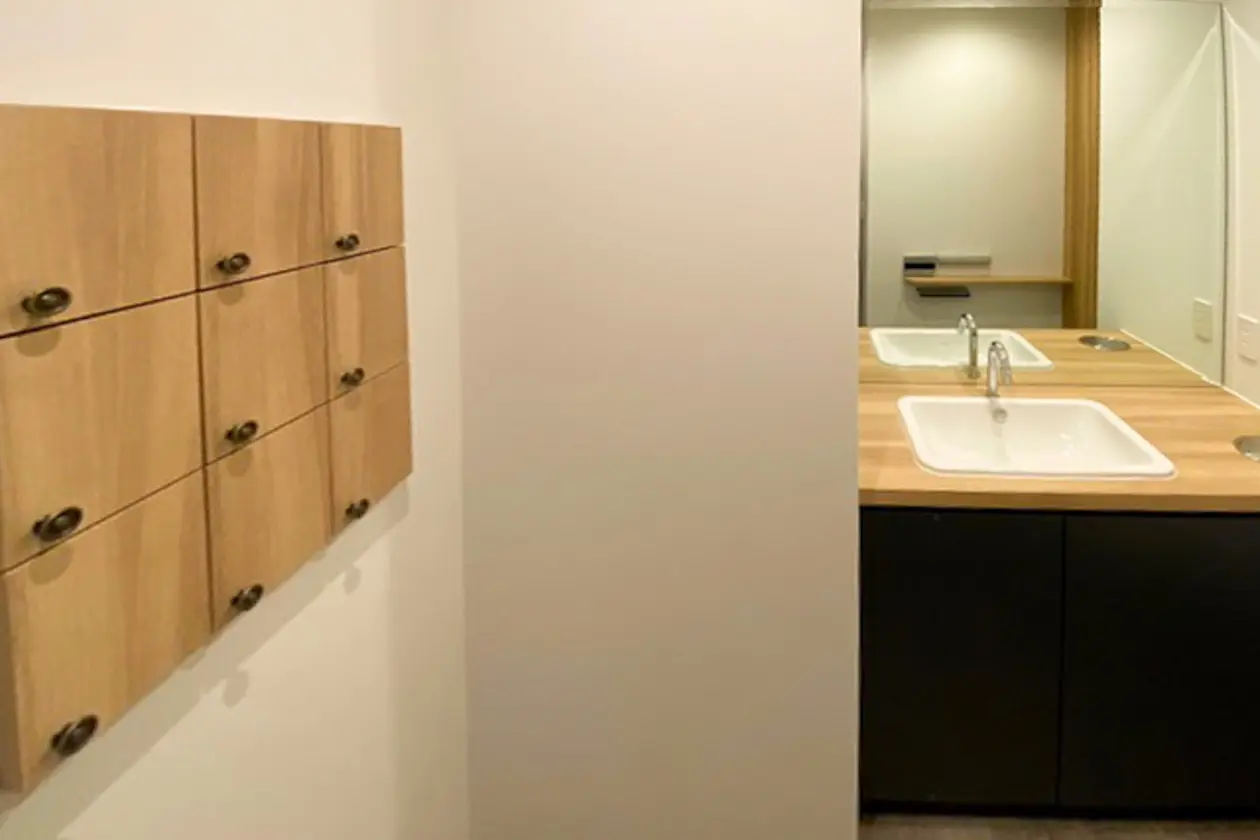 デザイン性の高い水回りには多目的に使える収納棚もあり、利便性を高めています。