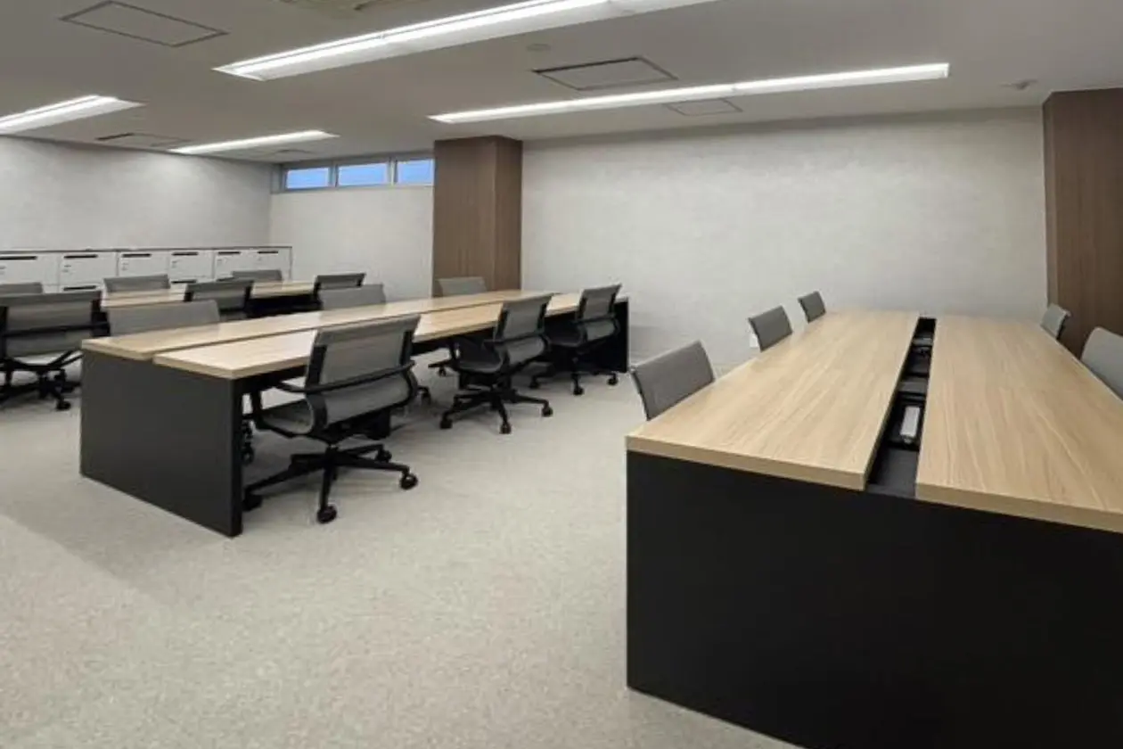 デスクは対面型レイアウトで、チームワークを重視した業務に適した構成。
