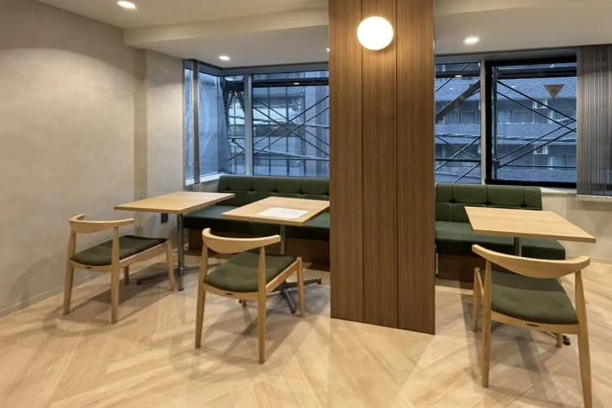 ナチュラルな木目とグリーンのソファが調和した、落ち着きのあるラウンジスペース。