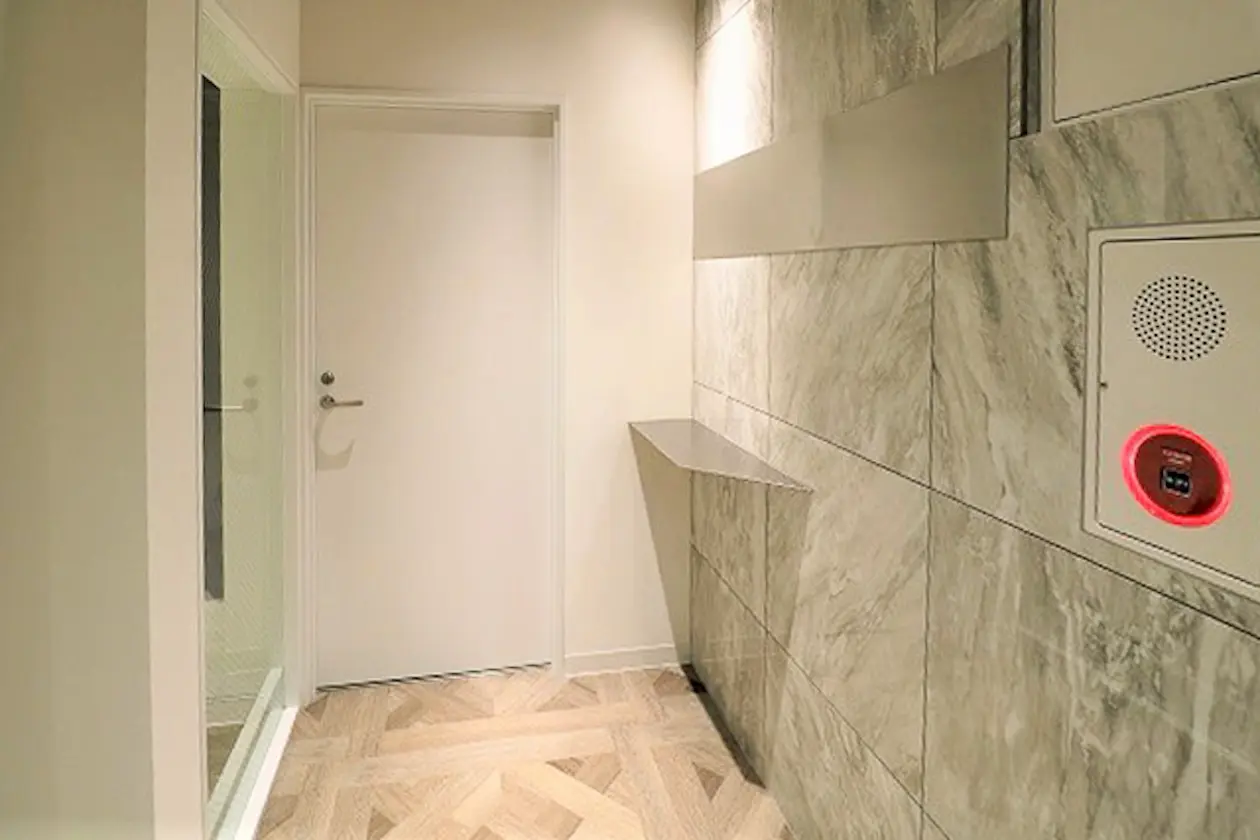 エントランスから続くアプローチは、ヘリンボーン調の床と石目調の壁が印象的。コンパクトながらも素材感にこだわった設えで、シンプルな中に程よい上質さを感じさせます。