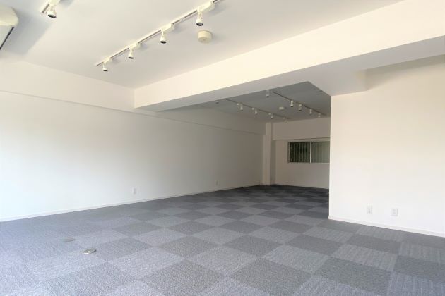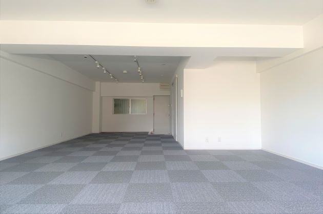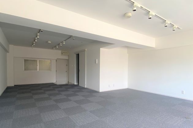 シンプルですが、カーペット床に天井・壁は白で統一、ライティングレールにスポットライトという、どのような家具にもあう空間です。