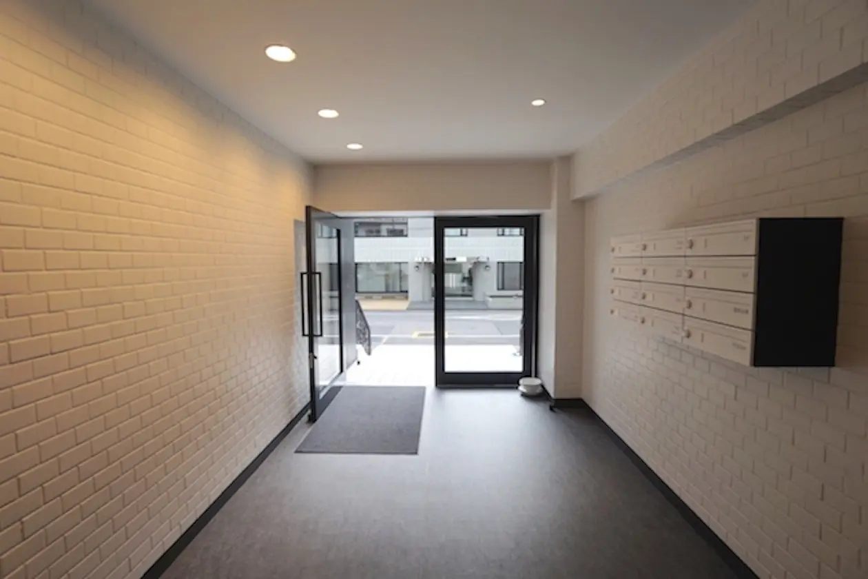 エントランスホールはブリックタイルに白塗装を施し明るい雰囲気にリノベーション。