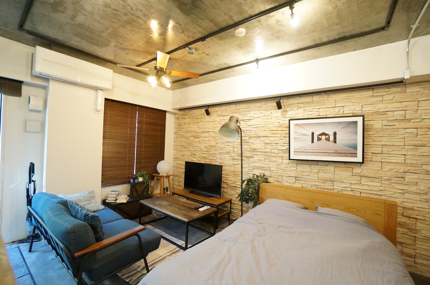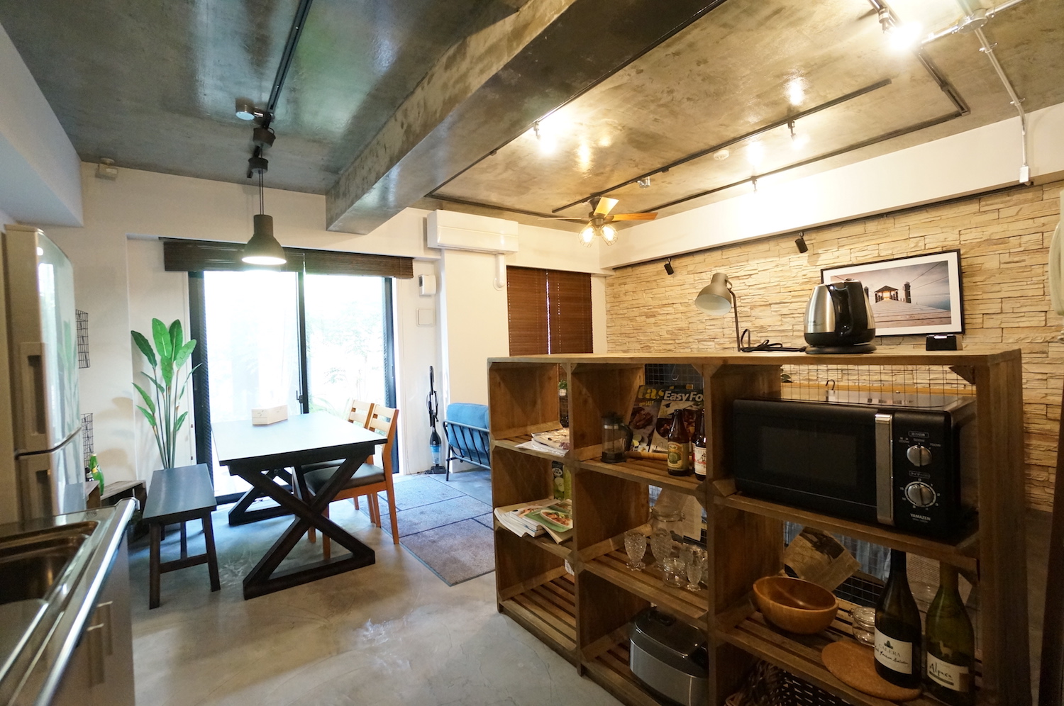 床はモルタル仕様、天井はコンクリート打ちっ放し、壁にも石材があしらわれたデザイン。