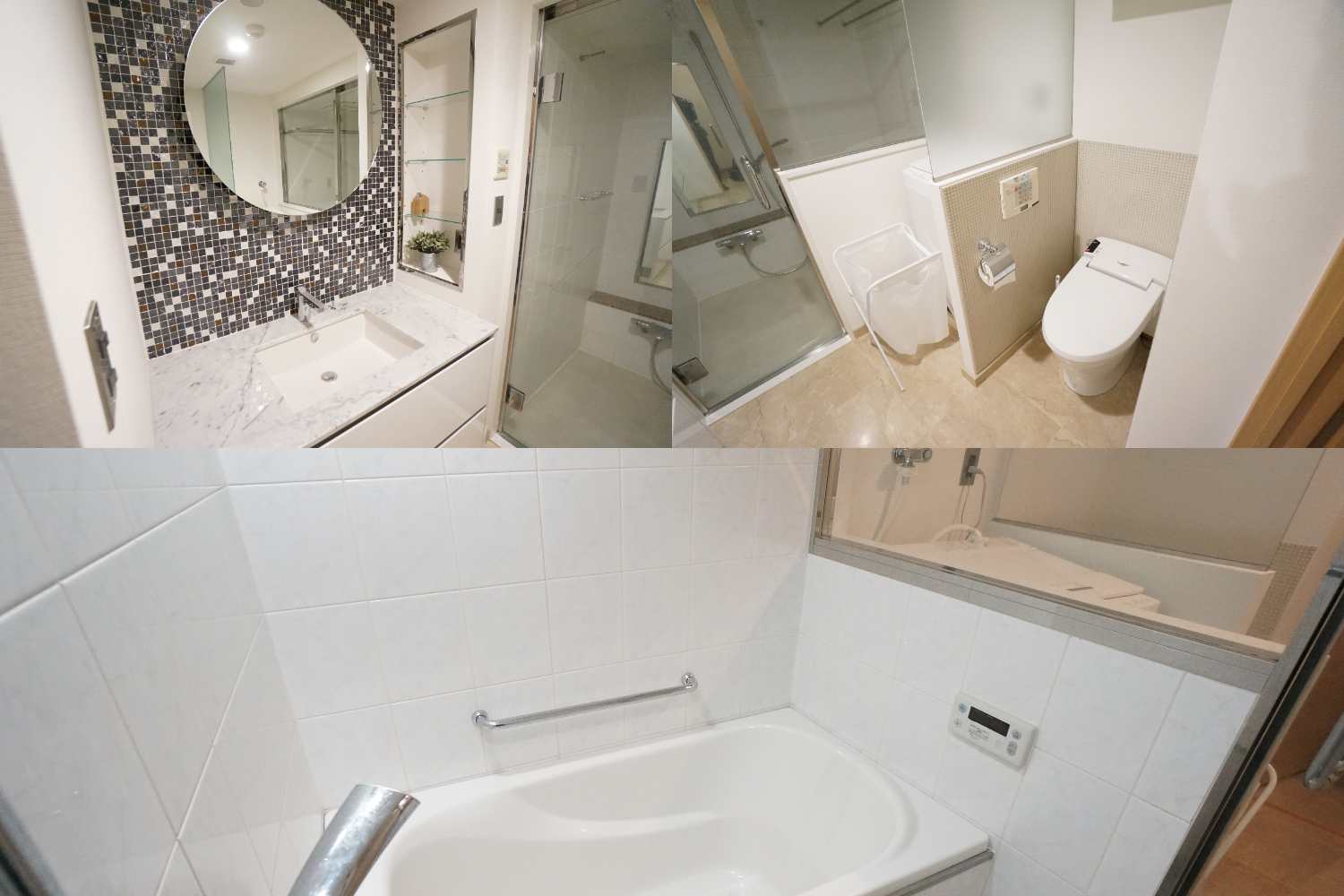 風呂はガラス張りとなっている、洗面台もタイルがあしらわれており清潔感の中に可愛らしさがある。