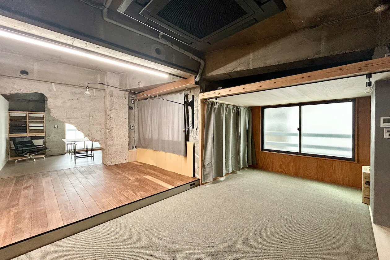 段差で緩やかに空間を分ける設計が、この物件の最大の個性です。天井はスケルトン仕様で、ライン照明が奥行きを演出しています。