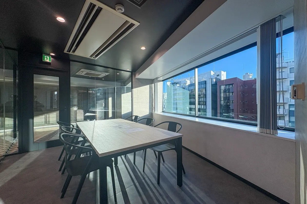 会議室には6名用テーブルがセットされており、入居初日から打ち合わせ環境が整うのも大きな利点である。ガラス越しに広がる街並みの眺望も、働く人にとって気持ちの良い背景となるだろう。