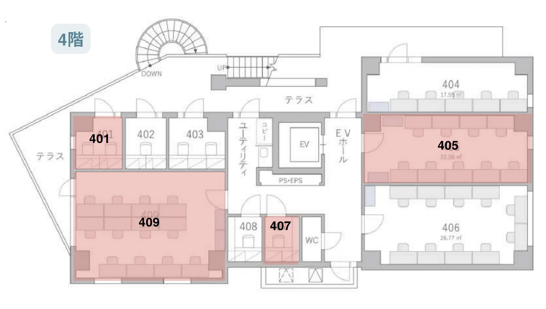 1〜4名用の家具付き完全個室Deskは32区画ご用意しております。